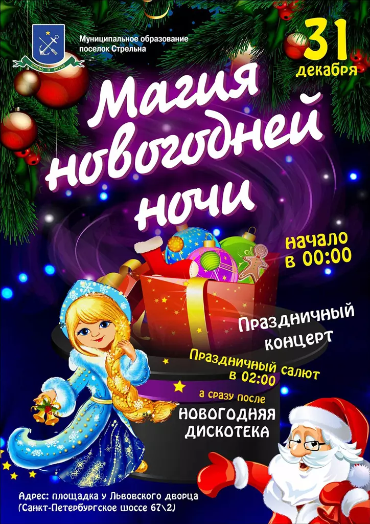 В новогоднюю ночь, как только куранты пробьют двенадцать раз, на площади у главной елки Стрельны начнется праздничная программа «Магия Новогодней ночи»: яркое барабанное шоу в исполнении «Drum time» (участников телевизионного шоу «Минута славы»), выступления хореографических и эстрадных коллективов.