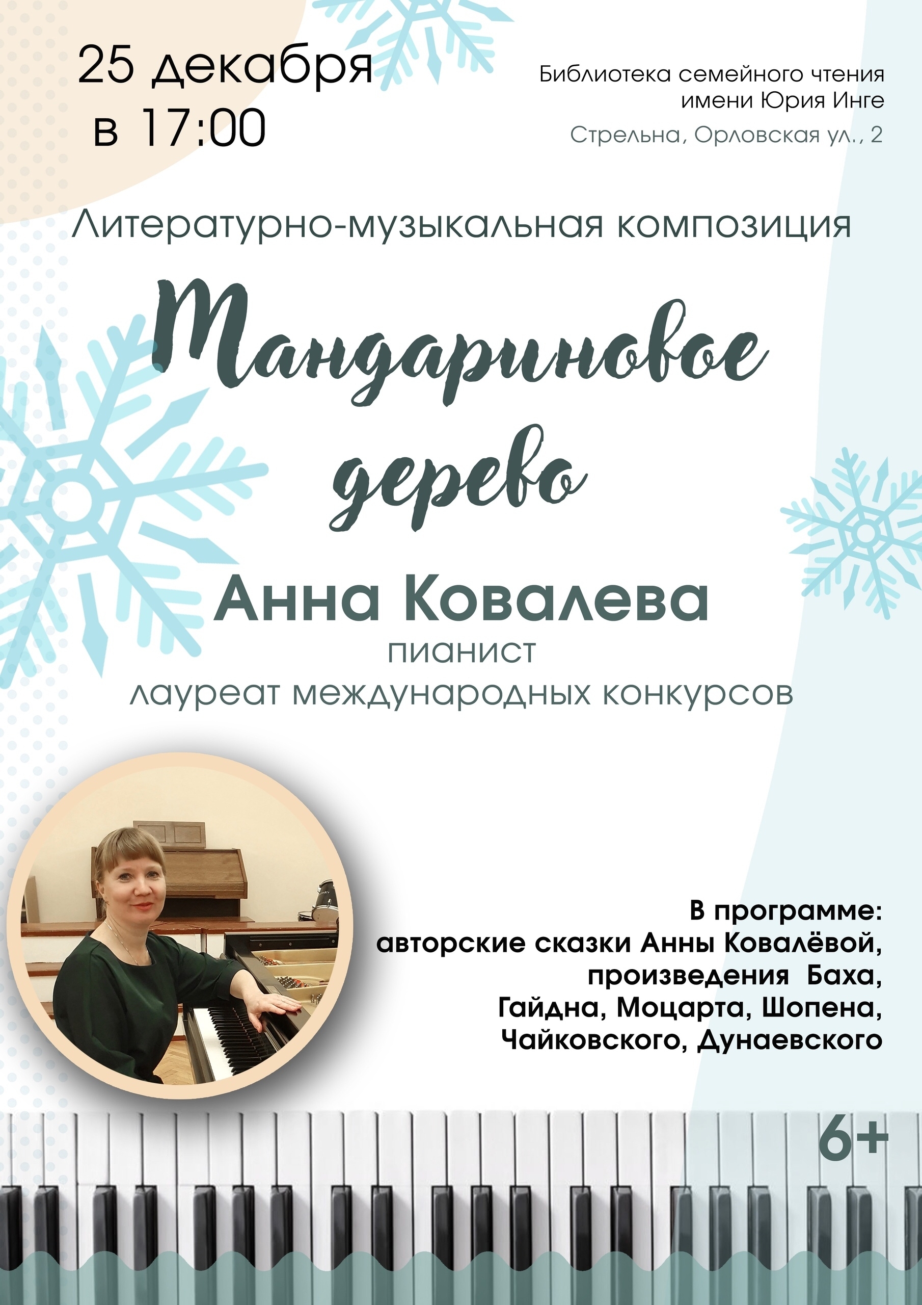 Библиотека семейного чтения имени Ю. Инге приглашает окунуться в зимнее волшебство, посетив 25 декабря в 17:00 литературно-музыкальную композицию «Мандариновое дерево».