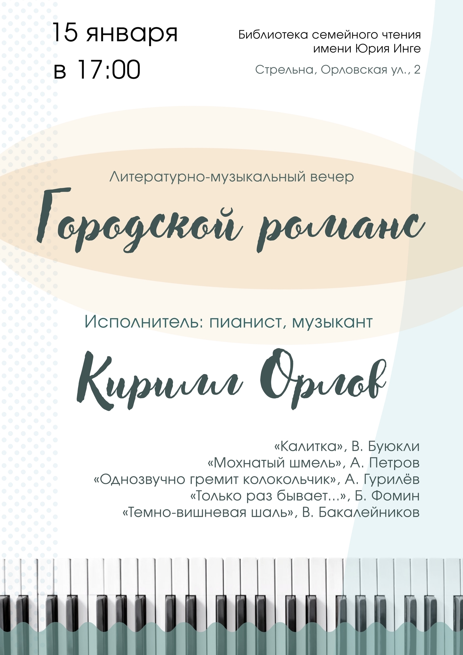 15 января в 17:00 Библиотека семейного чтения имени Ю. Инге (ул. Орловская, 2) приглашает на литературно-музыкальный вечер пианиста Кирилла Орлова с программой "Городской романс".