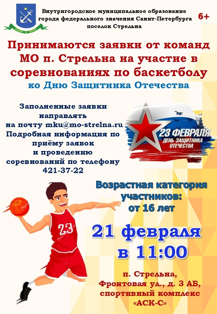 21 февраля в 11:00 в спортивном комплексе «АСК-с» состоятся соревнования по баскетболу. Для участия необходимо прислать заявку по форме в электронном виде на почту mku@mo-strelna.ru.
