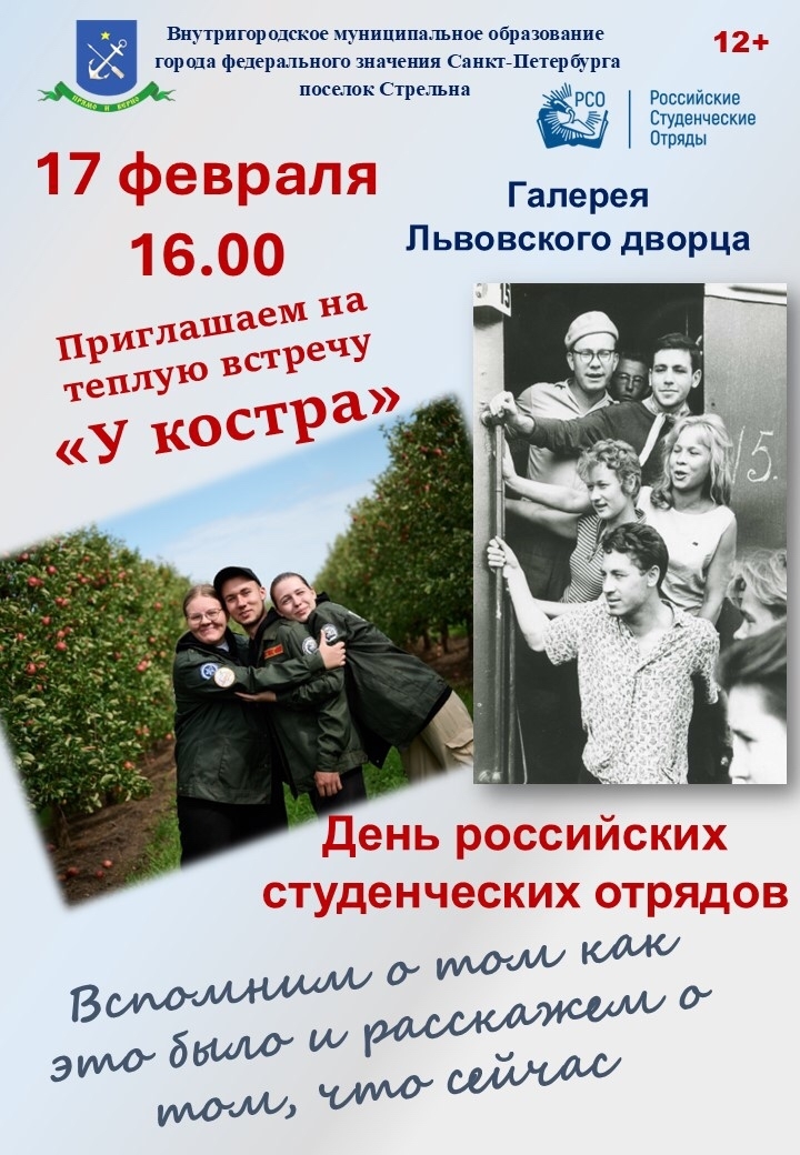 17 февраля в 16:00 в галерее Львовского дворца (Санкт-Петербургское шоссе, 69) состоится встреча «У костра», посвященная Дню российских студенческих отрядов.