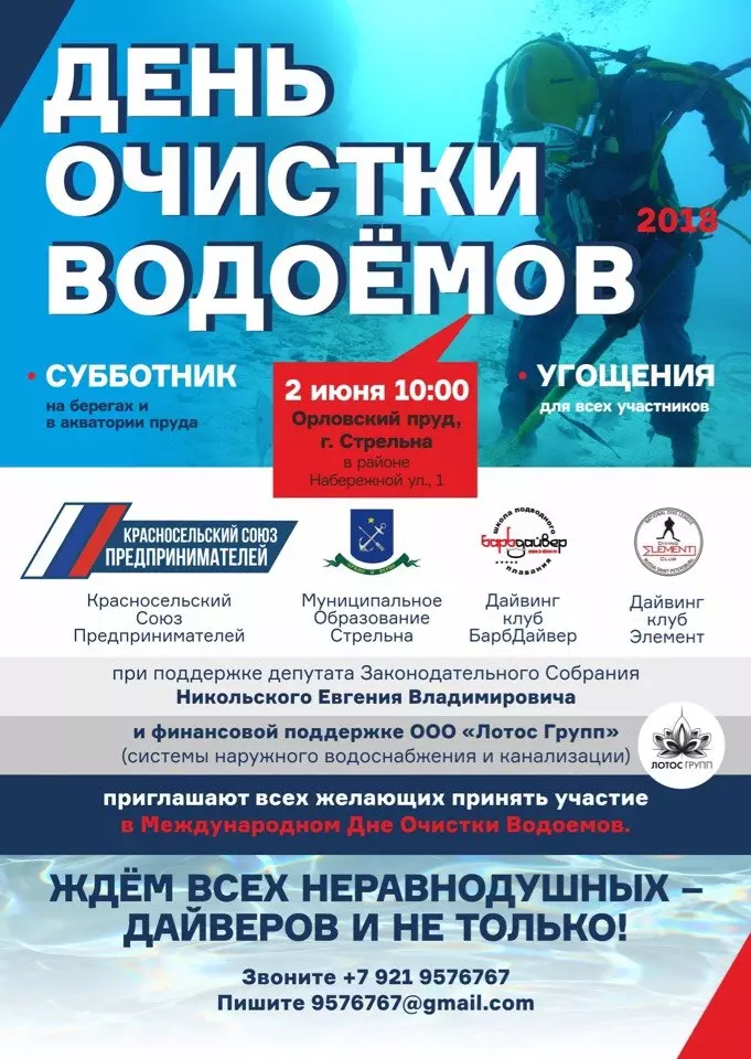 Опытные дайверы (10-20 человек) чистят дно водоёма от мусора, передают мешки с мусором на берег, далее все складируется в мусорный контейнер. Вызвались нам помочь и хозяева собак-водолазов. Около 13:00 – окончание очистки, подведение итогов, угощение (полевая кухня, шашлыки) для участников, мастер-классы и фотографирование с дайверами и собаками-водолазами. Место встречи отмечено на картах.