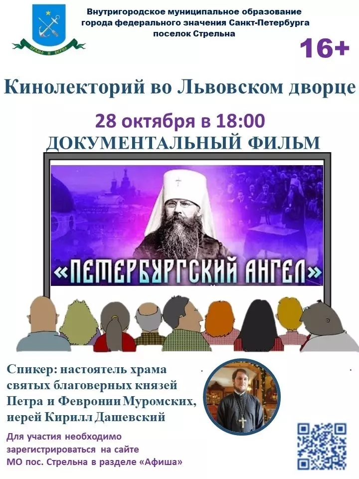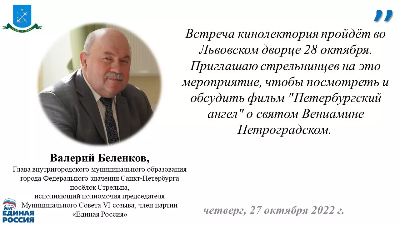 «Встреча кинолектория пройдёт во Львовском дворце 28 октября. Приглашаю стрельнинцев на это мероприятие, чтобы посмотреть и обсудить фильм "Петербургский ангел" о святом Вениамине Петроградском», — напомнил глава МО пос. Стрельна Валерий Беленков.