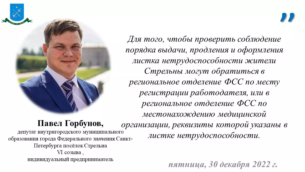 «Для того, чтобы проверить соблюдение порядка выдачи, продления и оформления листка нетрудоспособности жители Стрельны могут обратиться в региональное отделение ФСС по месту регистрации работодателя, или в региональное отделение ФСС по местонахождению медицинской организации, реквизиты которой указаны в листке нетрудоспособности», — рассказал депутат МО пос. Стрельна Павел Горбунов.