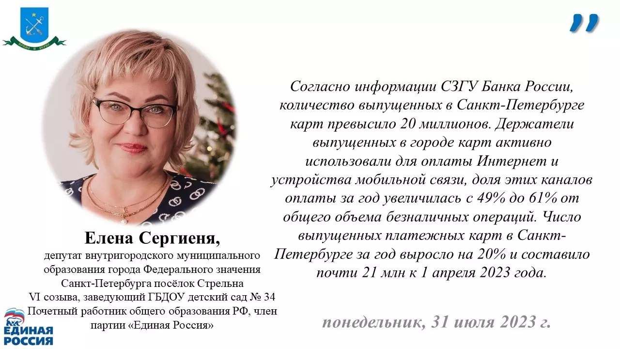 «Согласно информации СЗГУ Банка России, количество выпущенных в Санкт-Петербурге карт превысило 20 миллионов. Держатели выпущенных в городе карт активно использовали их для оплаты Интернет и устройства мобильной связи, доля этих каналов оплаты за год увеличилась с 49% до 61% от общего объёма безналичных операций. Число выпущенных платёжных карт в Санкт-Петербурге за год выросло на 20% и составило почти 21 млн к 1 апреля 2023 года», – процитировала информацию депутат МО пос. Стрельна Елена Александровна Сергиеня.