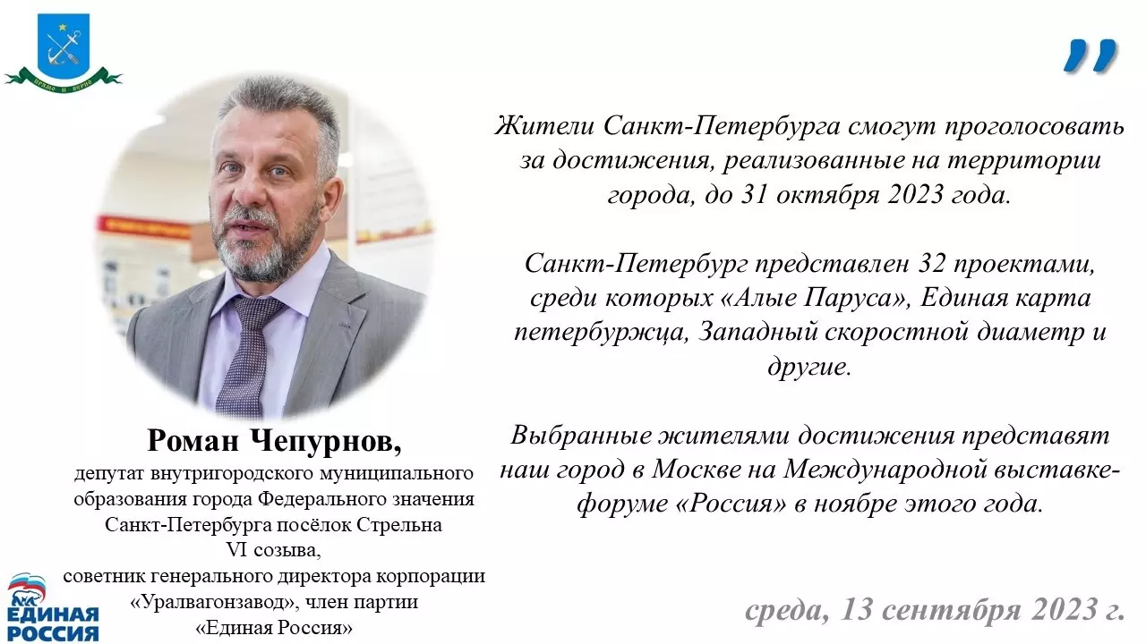 «Жители Санкт-Петербурга смогут проголосовать за достижения, реализованные на территории города, до 31 октября 2023 года, — отмечает депутат Роман Чепурнов. — Санкт-Петербург представлен 32 проектами, среди которых "Алые Паруса", Единая карта петербуржца, Западный скоростной диаметр и другие. Выбранные жителями достижения представят наш город в Москве на Международной выставке-форуме "Россия" в ноябре этого года».
