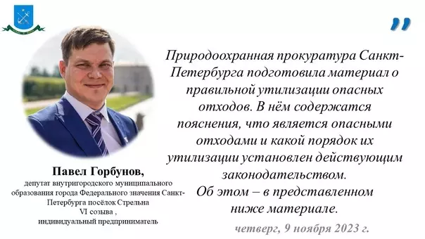 «Природоохранная прокуратура Санкт-Петербурга подготовила материал о правильной утилизации опасных отходов. В нём содержатся пояснения, что является опасными отходами и какой порядок их утилизации установлен действующим законодательством. Об этом – в представленном ниже материале», — уточнил депутат МО пос. Стрельна Павел Горбунов.