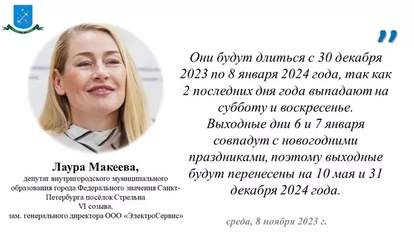 И пусть сейчас ноябрь, о новогодних выходных известно заранее? О них стрельнинцам напомнила депутат Лаура Макеева. Новогодние каникулы продлятся целых 10 дней: «Они будут длиться с 30 декабря 2023 по 8 января 2024 года, так как 2 последних дня года выпадают на субботу и воскресенье.