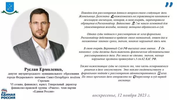 По этим причинам дело отправлено на пересмотр в суд первой инстанции», — рассказал депутат МО пос. Стрельна Руслан Ермоленко.