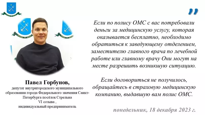 Депутат МО пос. Стрельна Павел Горбунов предлагает обращаться к руководству медицинского учреждения при попытках получить деньги за бесплатную услугу:
