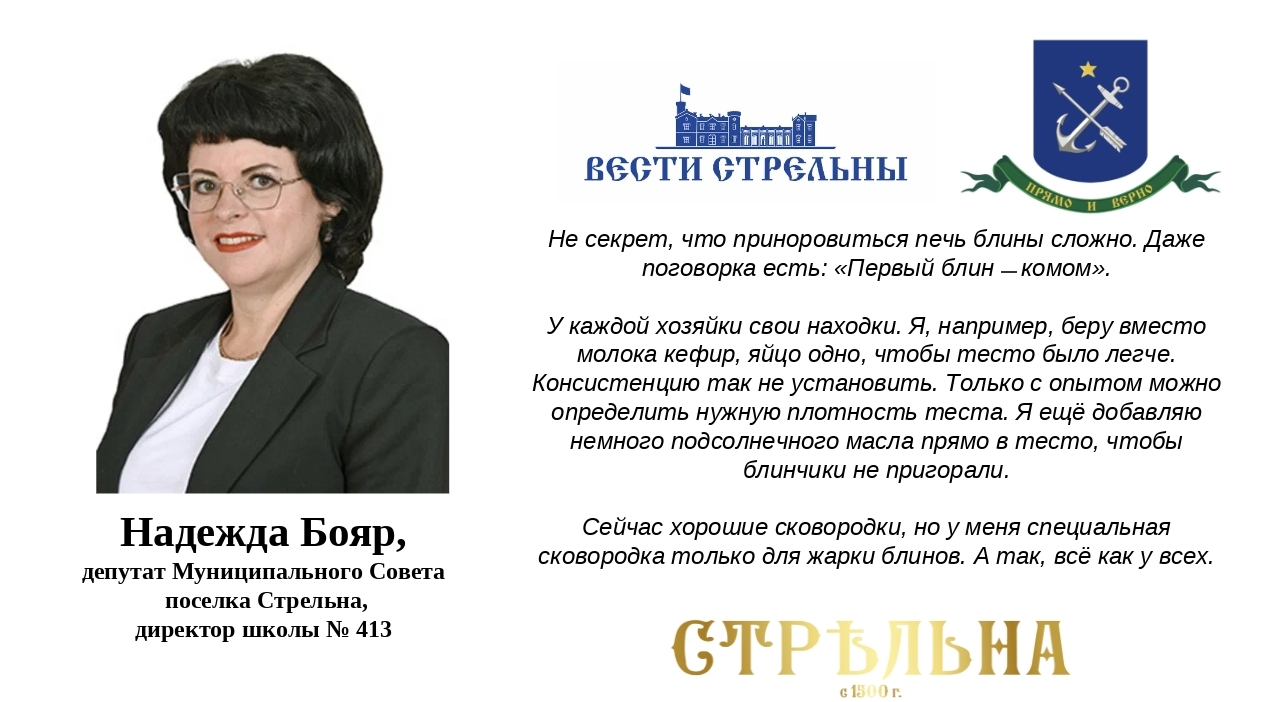 А первой свой фирменный рецепт блинов рассказала депутат Муниципального совета Стрельны Надежда Бояр.