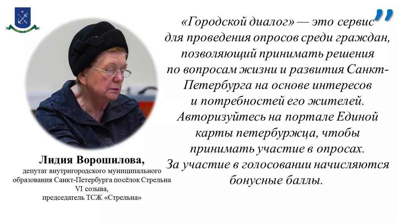 «"Городской диалог" — это сервис для проведения опросов среди граждан, позволяющий принимать решения по вопросам жизни и развития Санкт-Петербурга на основе интересов и потребностей его жителей. Авторизуйтесь на портале Единой карты петербуржца, чтобы принимать участие в опросах. За участие в голосовании начисляются бонусные баллы», — напоминает депутат МО пос. Стрельна Лидия Ворошилова.