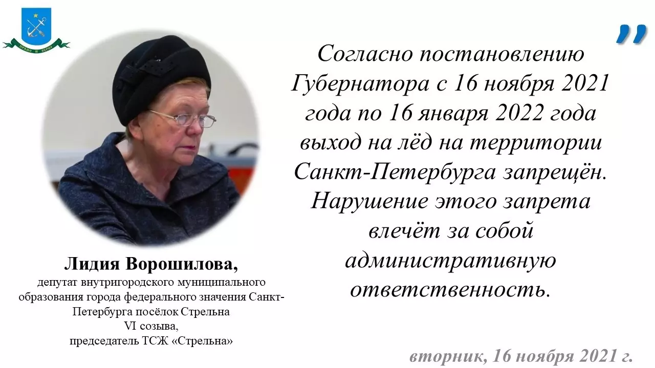 Согласно документу запрет выхода на ледовое покрытие водных объектов в Санкт Петербурге устанавливается на период с 16 ноября 2021 года по 15 апреля 2022 года.