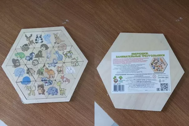 — набор деревянных игрушек в пазлах «зверюшки, занимательные треугольники»;