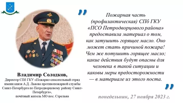 «Пожарная часть (профилактическая) СПб ГКУ "ПСО Петродворцового района" предоставила материал о том, как затушить горящее масло. Оно может стать причиной пожара! Чем же потушить горящее масло; какие действия будут опасны для человека в такой ситуации и каковы меры предосторожности — в материале из этого поста», — уточнил директор СПБ ГКУ «ПСО Петродворцового района» Владимир Солодков.