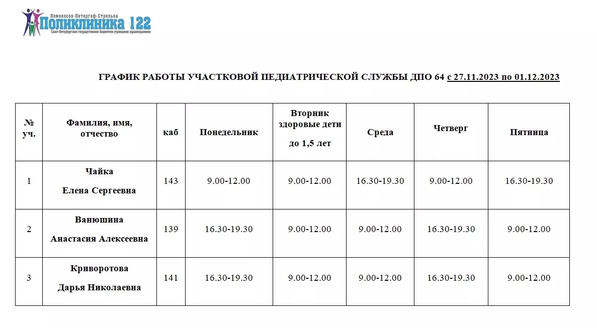 СПб ГБУЗ «Городская поликлиника № 122» ДПО 64 (Стрельна) опубликовала график работы врачей-специалистов и участковых педиатрической службы в период с 27 ноября по 01 декабря.