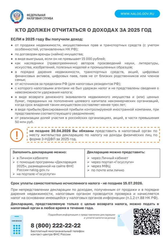 ФНС России информирует о сроках и способах подачи декларации 3-НДФЛ за 2025 год