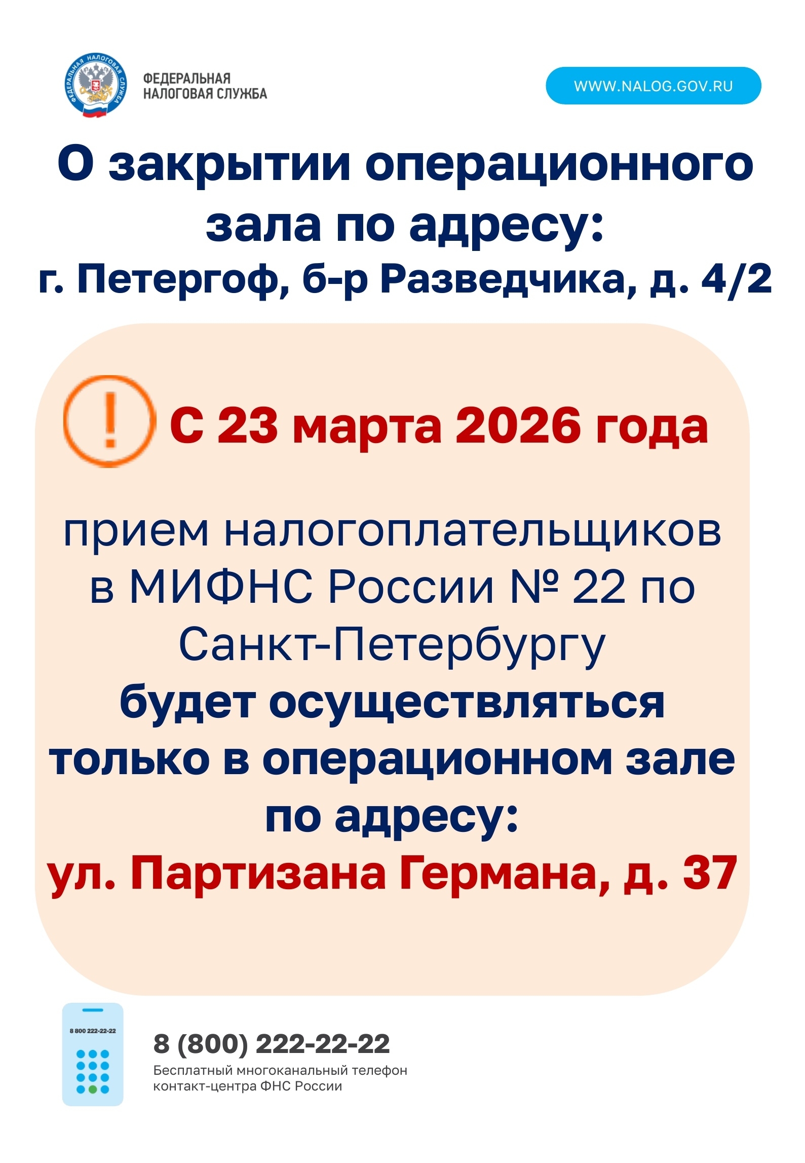 ️Внимание! С 23 марта 2026 года прием налогоплательщиков в МИФНС России № 22 по Санкт-Петербургу будет осуществляться только в операционном зале по адресу: ул. Партизана Германа, д. 37.