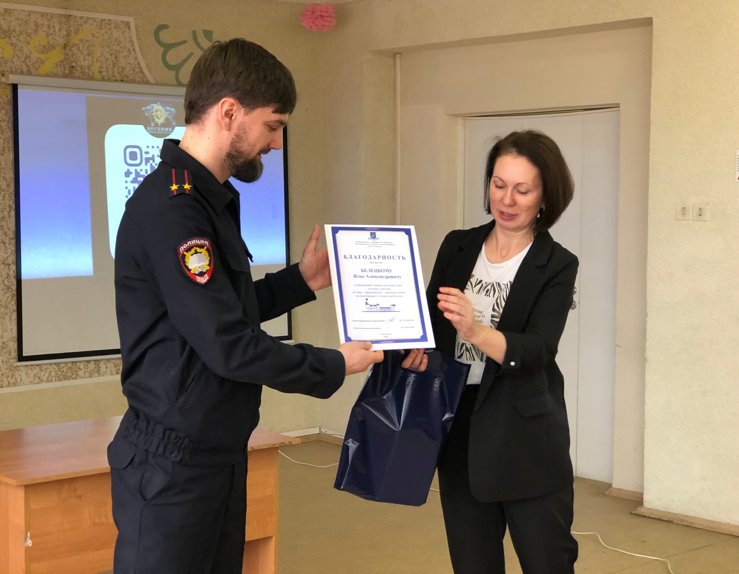 Ирина Сошникова поблагодарила Илью Александровича за беседу и вручила грамоту от муниципалитета Стрельны, выразив уверенность в том, что его сегодняшний рассказ останется в памяти у ребят и поможет им избежать неприятностей.