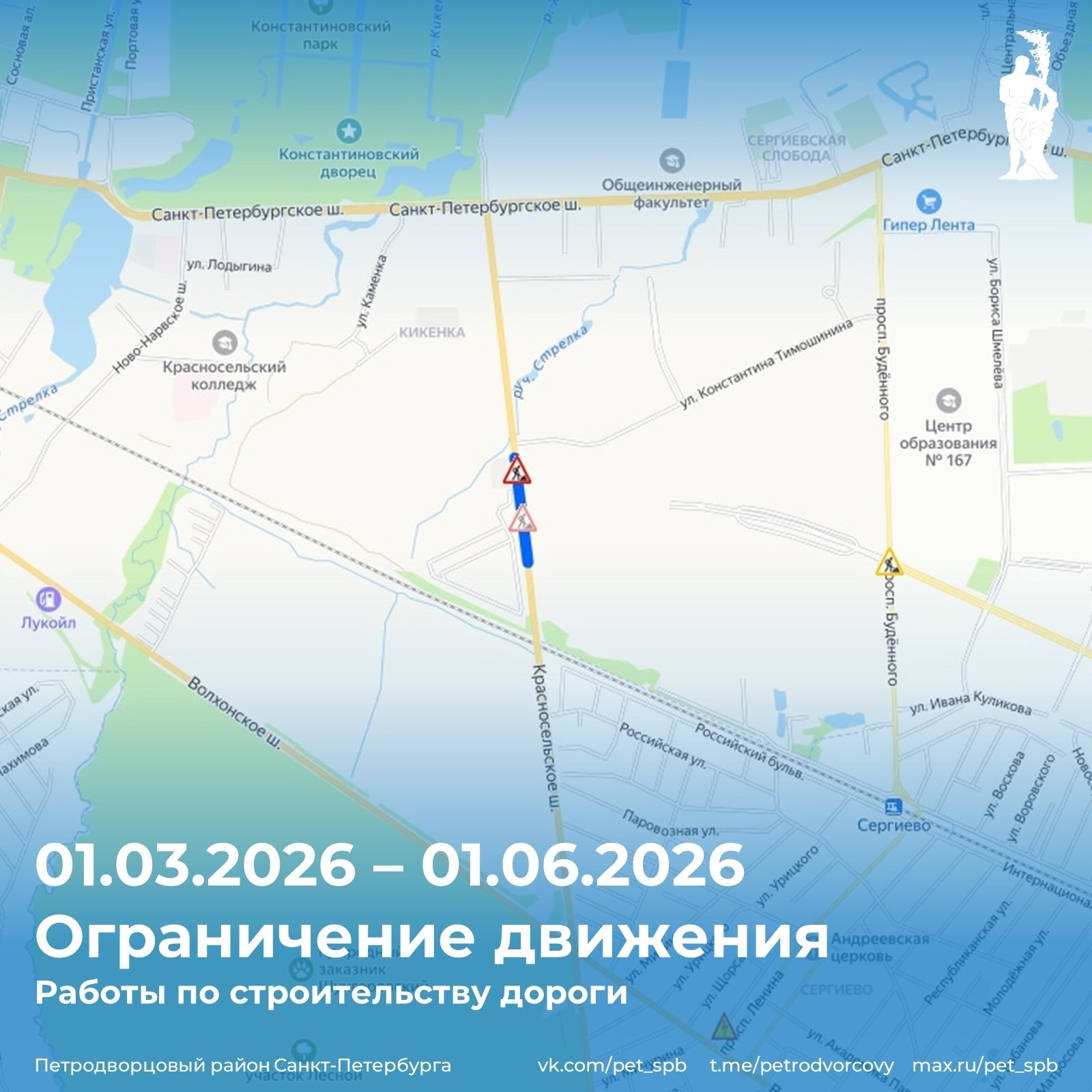 С 1 марта по 1 июня ограничивается движение транспорта по Красносельскому шоссе в посёлке Стрельна — от Сергиевского путепровода до дома 72 литера А по Красносельскому шоссе, с закрытием движения по Красносельскому шоссе с организацией проезда по временной дороге. Ограничения связаны с производством работ по строительству дороги.