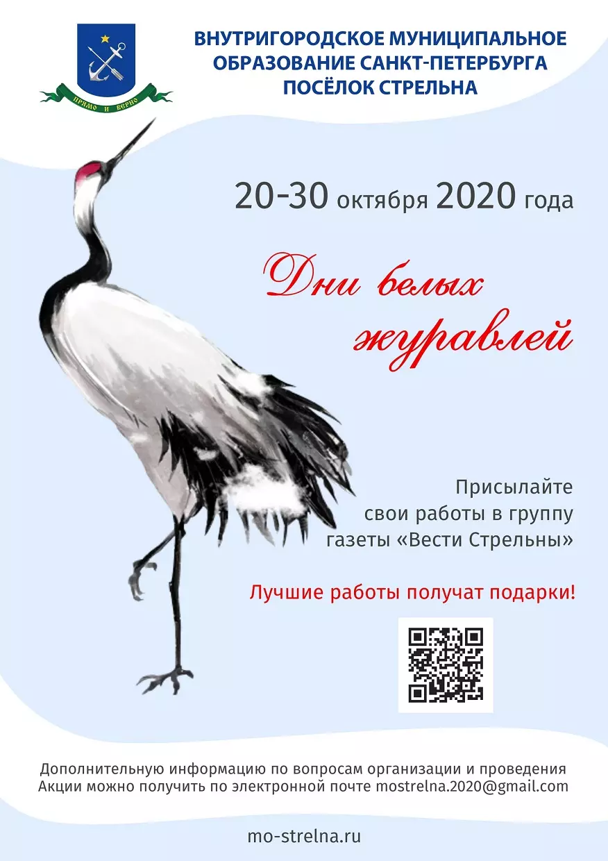 В муниципальном образовании посёлок Стрельна стартует акция «Дни белых журавлей». Акция пройдёт с 20 по 30 октября.