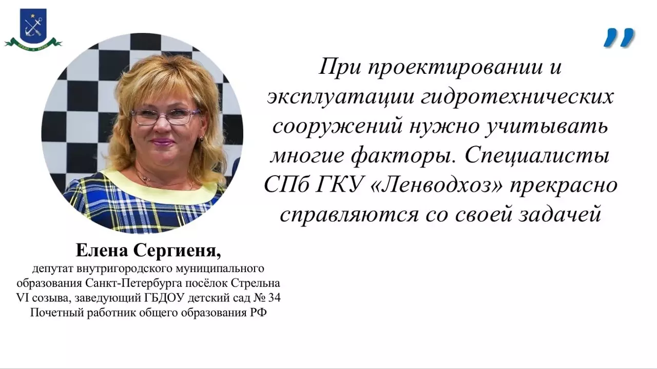 «При проектировании и эксплуатации гидротехнических сооружений нужно учитывать многие факторы. Специалисты СПб ГКУ “Ленводхоз” прекрасно справляются со своей задачей», — благодарит сотрудников СПб ГКУ «Ленводхоз» Елена Сергиеня.