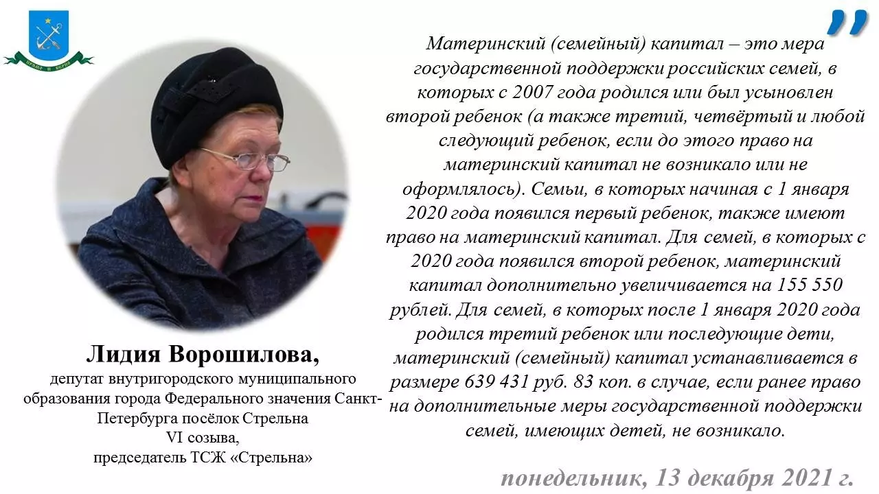 «Материнский (семейный) капитал – это мера государственной поддержки российских семей, в которых с 2007 года родился или был усыновлен второй ребенок (а также третий, четвёртый и любой следующий ребенок, если до этого право на материнский капитал не возникало или не оформлялось). Семьи, в которых начиная с 1 января 2020 года появился первый ребенок, также имеют право на материнский капитал. Для семей, в которых с 2020 года появился второй ребенок, материнский капитал дополнительно увеличивается на 155 550 рублей. Для семей, в которых после 1 января 2020 года родился третий ребенок или последующие дети, материнский (семейный) капитал устанавливается в размере 639 431 руб. 83 коп. в случае, если ранее право на дополнительные меры государственной поддержки семей, имеющих детей, не возникало», — напоминает депутат МО пос. Стрельна Лидия Ворошилова.